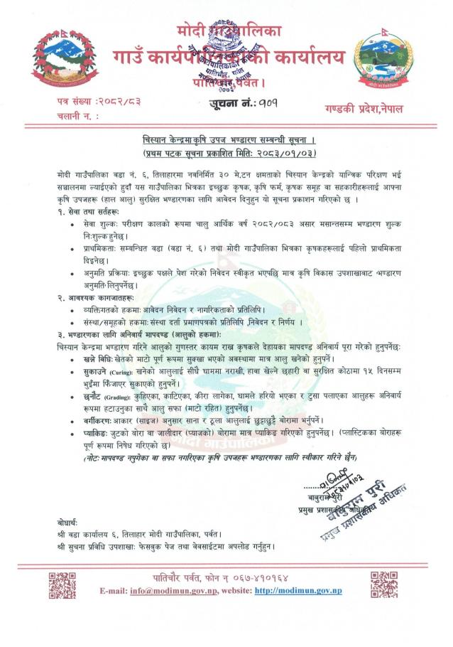 चिस्यान केन्द्रमा कृषि उपज भण्डारण सम्बन्धी सूचना l