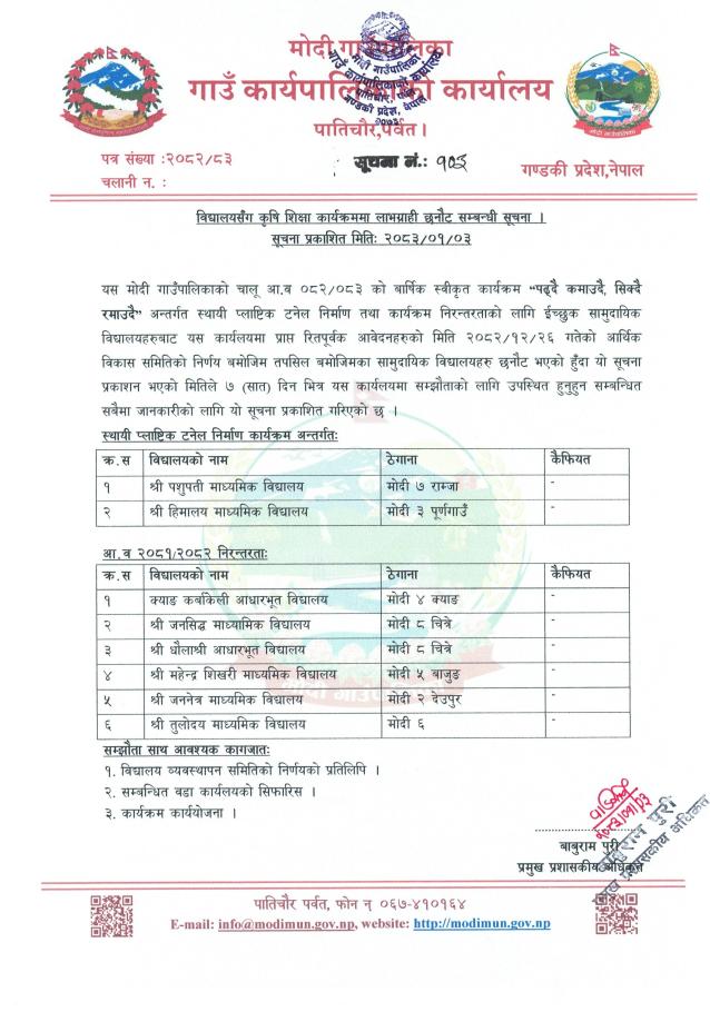 » बिद्यालय कृषि शिक्षा कार्यक्रममा लाभग्राही छनौटको सूचना ।