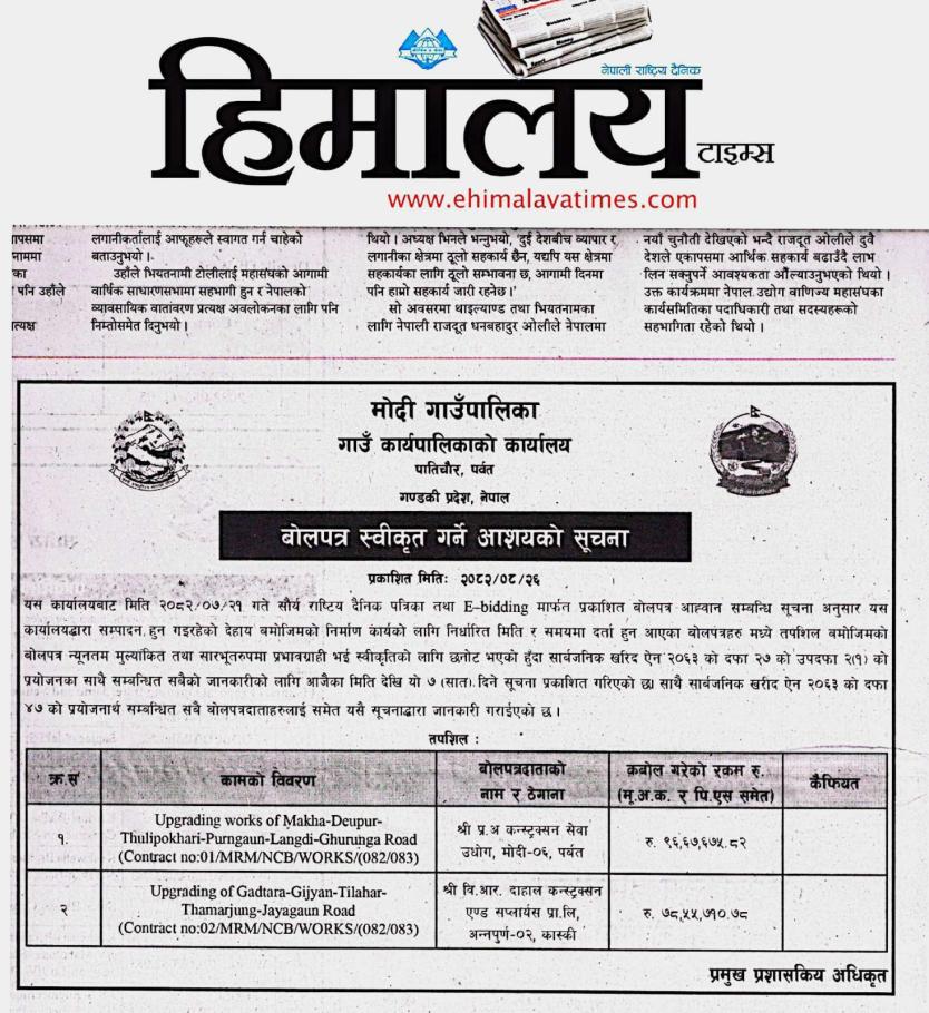 » बोलपत्र स्वीकृत गर्ने आशयको सूचना !