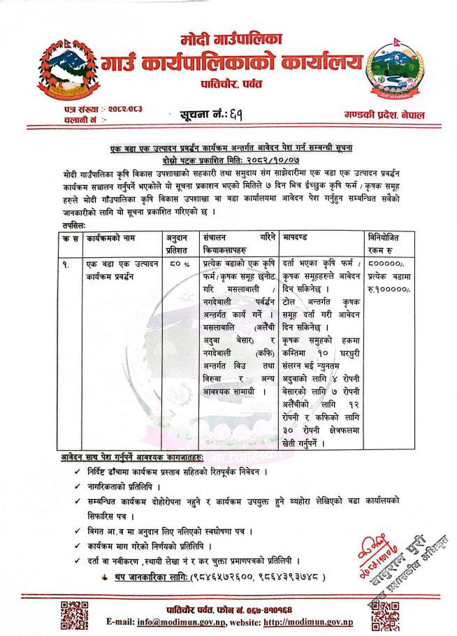 एक वडा एक उत्पादन प्रवर्द्धन कार्यक्रम अन्तर्गत आवेदन पेश गर्न सम्बन्धी सूचना l