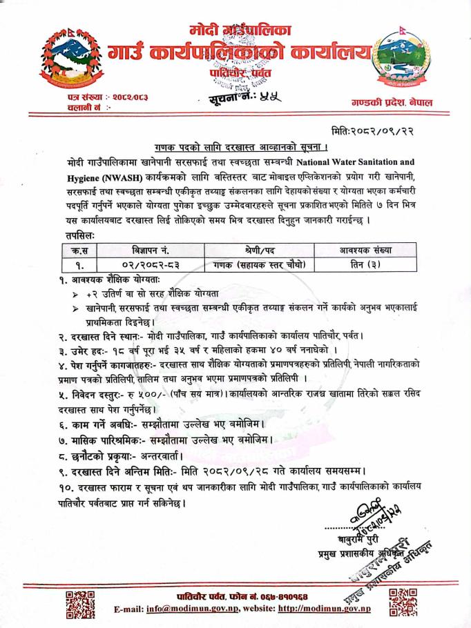 गणक तथा सुपरिवेक्षक पद करारमा पदपूर्तिको दरखास्त आव्हानको सुचना |