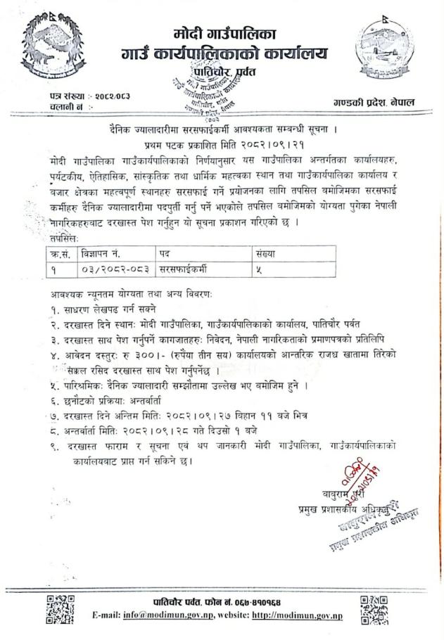 दैनिक ज्यालादारीमा सरसफाई कर्मचारी आवश्यकता सम्बन्धी सुचना l