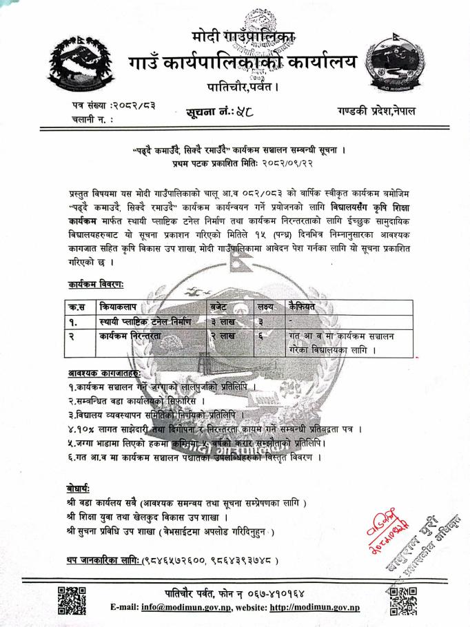 मोदी प्राङ्गगारिक नमुना कृषि गाउँ स्थापनाको प्रस्ताब पेश गर्ने सम्बन्धी सुचना |