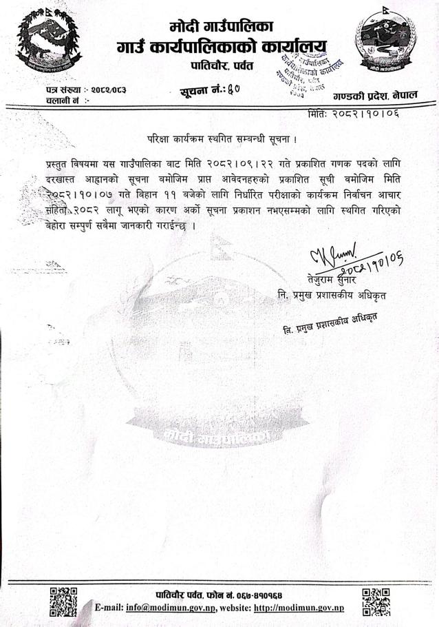 आधारभूत तह उतिर्ण (कक्षा ८) को परिक्षा संचालन समय तालिका प्रकाशन सम्बन्धी मोदी गाउँपालिकाको सुचना !
