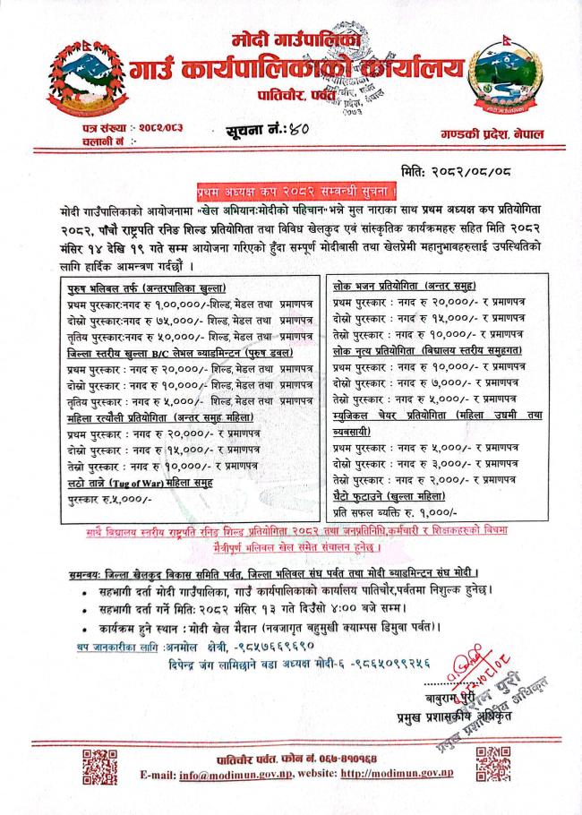 प्रथम अध्यक्ष कप २०८२ सम्बन्धी सूचना l