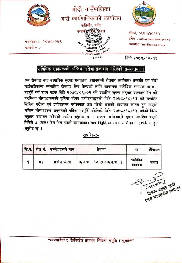 प्राविधिक सहायकको अन्तिम नतिजा प्रकाशन गरिएको सम्बन्धमा ।