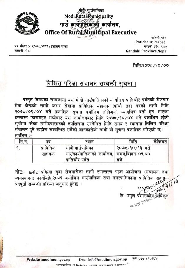 » प्राविधिक सहायक पदको लिखित परिक्षा संचालन गर्ने सम्बन्धी सुचना ।