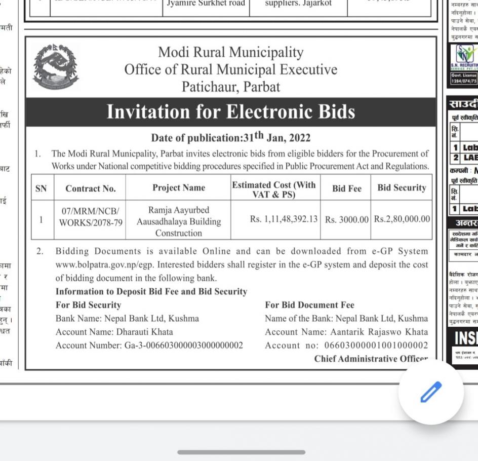 राम्जा आयूर्वेद भवन निर्माणको बोलपत्र आव्हान सम्बन्धी सूचना ।