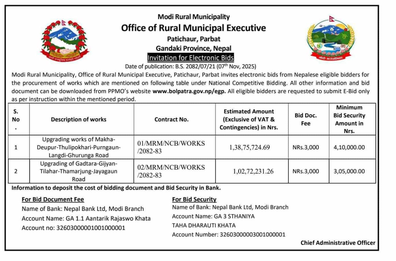 सडक स्तरोन्नती सम्बन्धी ठेक्का आव्हानको सूचना ।