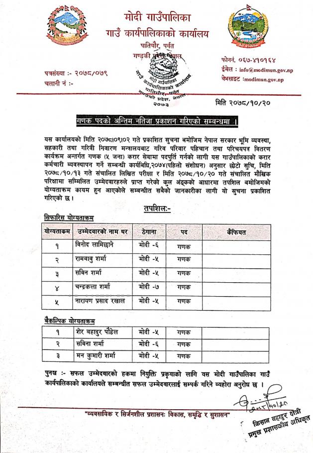 » सुपरिवेक्षक तथा गणक पदको अन्तिम नतिजा प्रकाशन गरिएको सम्बन्धी सुचना ।