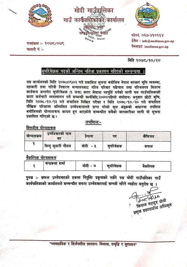 सुपरिवेक्षक तथा गणक पदको अन्तिम नतिजा प्रकाशन गरिएको सम्बन्धी सुचना ।