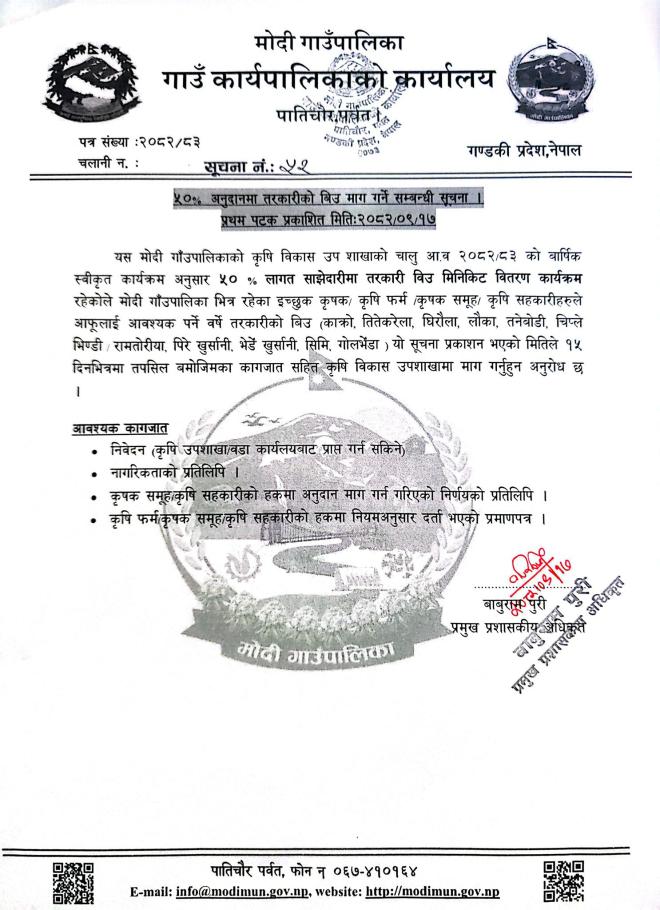 ५०% अनुदानमा तरकारी बीउ माग गर्ने सम्बन्धि सूचना ।